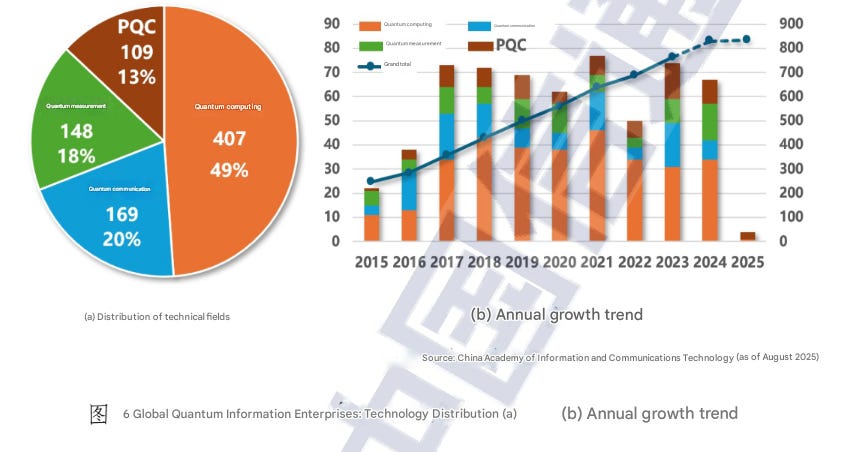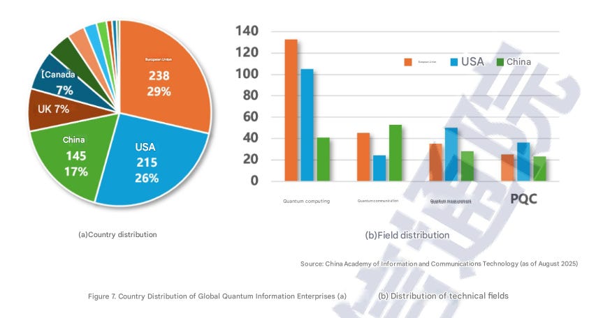 Caveats: While these reports are generally of high quality and I have no reason to distrust their statistics (of which there are a lot), I would caution the reader to keep in mind that such reports are often (deliberately?) incomplete: For example, you will find great aggregate statistics, but limited granular analysis of individual Chinese quantum companies or China’s quantum supply chain. Often, there is more granular detail on Western industry leaders and policy initiatives than on Chinese ones. I can only presume this is due to a combination of factors, including the sensitivity of the topic, Western export controls (to avoid getting anyone targeted), and the target audience and objectives of the report (domestic industry and policy makers, likely aiming to inform them about relevant foreign developments and important strategic gaps). Finally, keep in mind that the reports were published in late 2025; many of the statistics only reflect events up to August 2025.